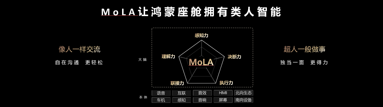 作为 HarmonySpace 5 起采用的核心架构,MoLA 通过融合多模态感知、通用大模型与垂域智能体,搭建起从用户意图到硬件执行的完整链路。其独创的全域免唤醒、导航三模式纠错等功能,让语音交互告别指令束缚。用户说 “车里有点暗” 即可开启阅读灯,导航时可随时改口调整目的地,彻底实现口语化控车。
