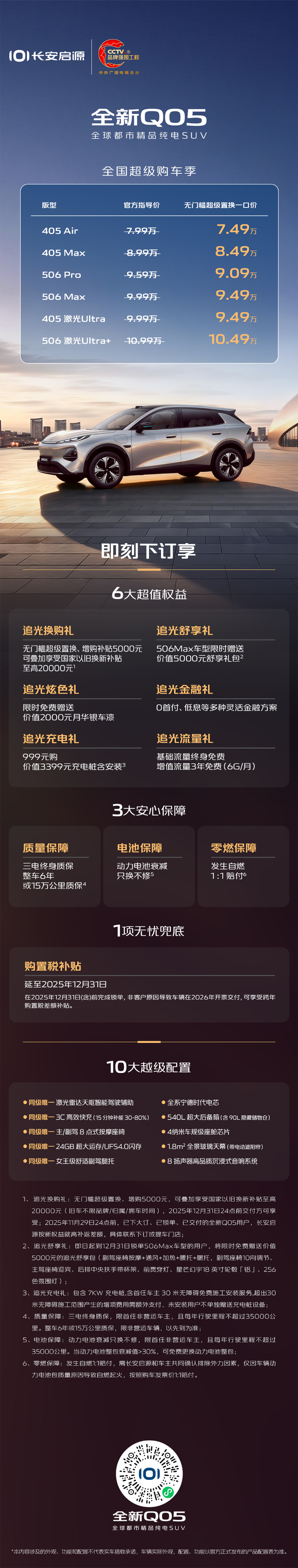 11月29日,长安启源全新Q05开启“超级购车季”,并宣布全面刷新用户购车权益,涵盖整车及三电系统的“三大安心保障”、购置税兜底政策延续至12月31日。同时,重磅推出全系无门槛超级置换、增购一口价,立省5000元,低至7.49万元起,并承诺对11月29日24点前“已下大订、已锁单,已交付”的用户,按照超级购车季新权益就高补返差额。