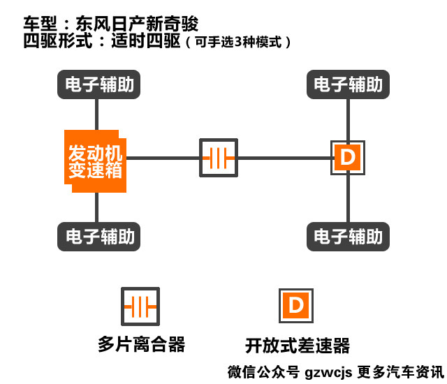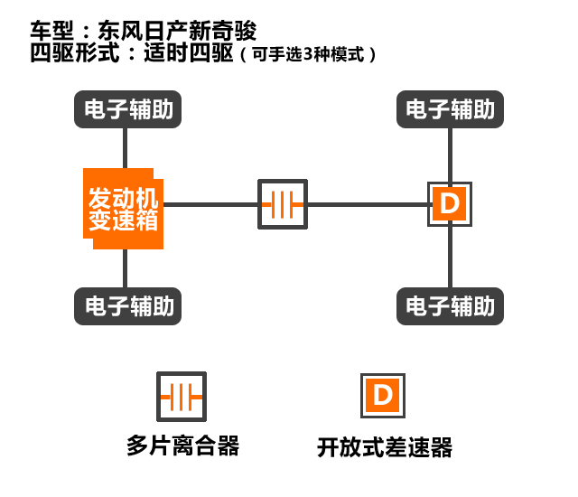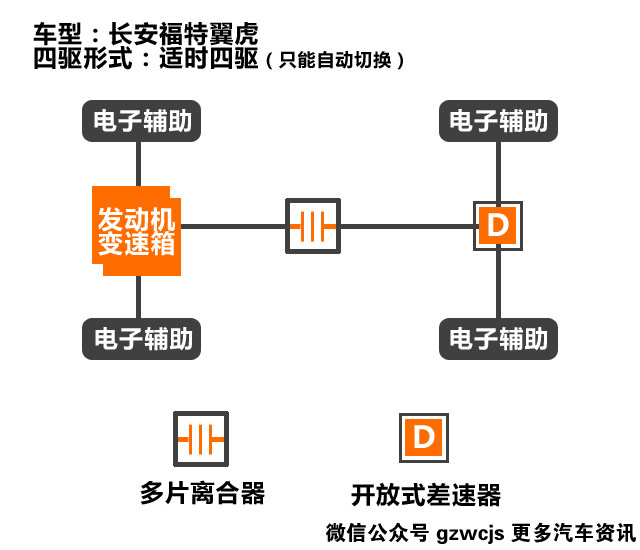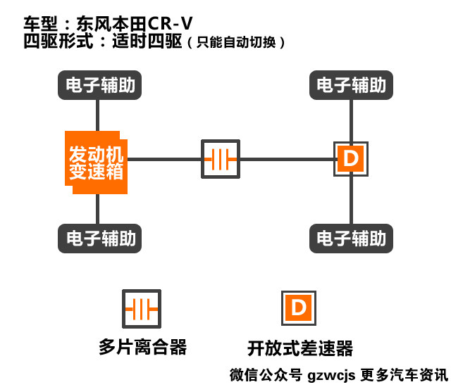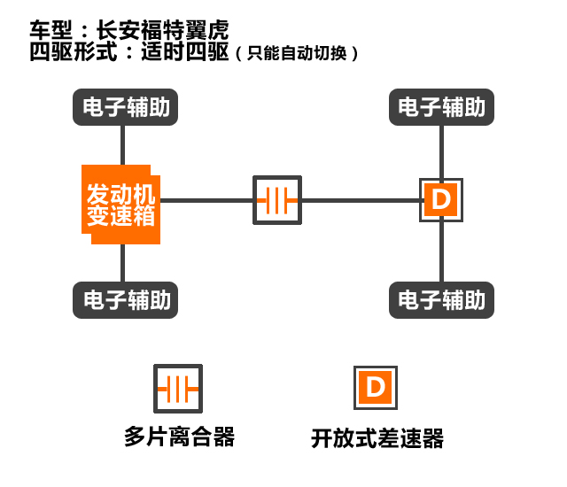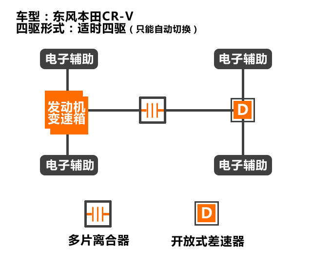 一般城市SUV都采用适时四驱结构,既满足了行驶需求,也保证了日常的油耗水平。大部分厂家会采用中央多片式离合器作为动力分配单元,根据工况对前后轮动力比例进行分配,结合电子驻车的差速功能,具备了一定轮间差速功能。