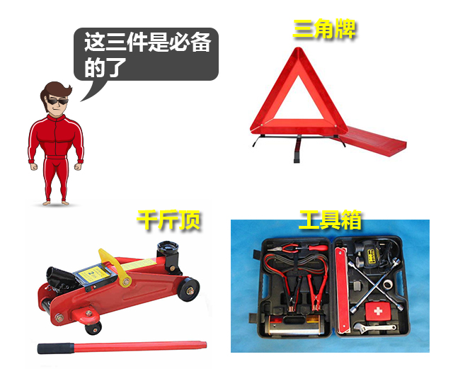 常用工具:千斤顶、工具盒、三角牌