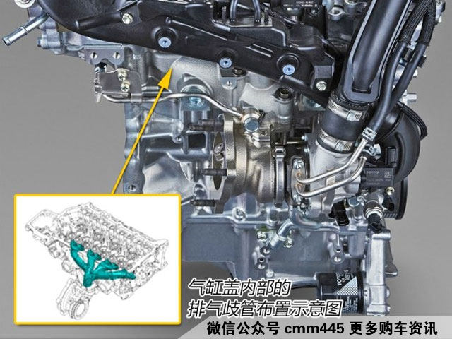 与不少主流发动机一样,丰田1.2T发动机也采用了集成式排气歧管技术。这项技术有利于水箱的温度上升,减少热车时间。同时,当发动机处于高负载的情况下,集成式排气歧管可有效降低排气温度,从而避免涡轮增压器的工作温度过高。另外,此技术还可有效提高废气与冷却液的热交换效率,以达到更好的燃油经济性。