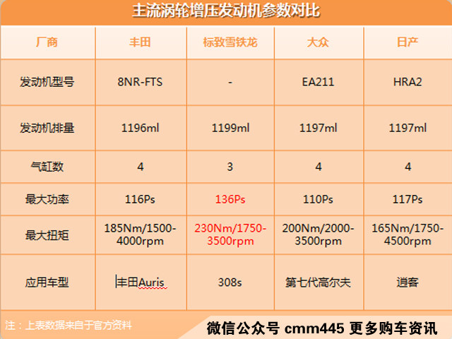 从表格中,可以看出同为1.2T发动机,丰田的调教明显偏保守,而最激进的就是PSA的。不过,丰田在海外有将1.2T发动机搭载于Auris,并且取得了5.15L/100km的好成绩。在国内,1.2T发动机最先搭载于卡罗拉上,工信部给出的百公里综合油耗,手动挡为5.7L,CVT为5.4L,这个成绩也是相当出色。