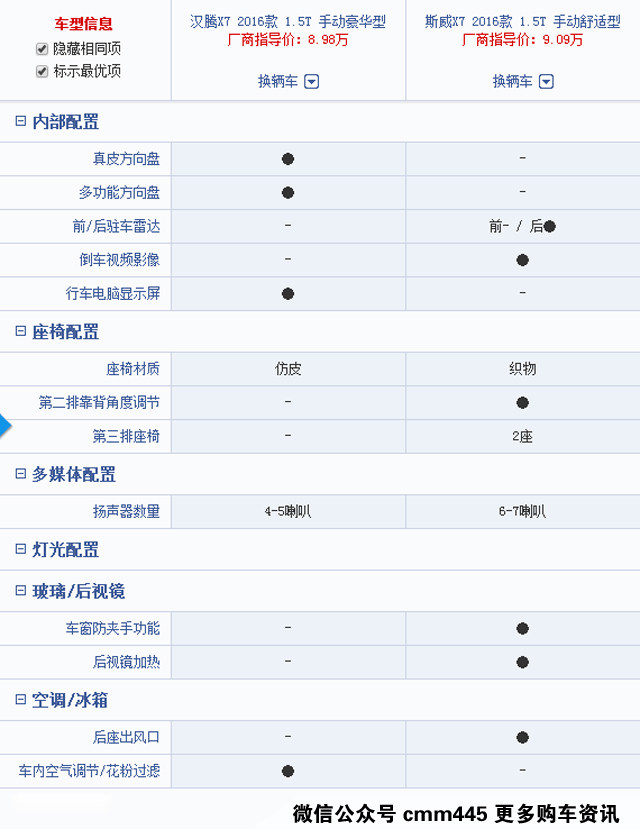从配置的对比上来看,两者各有千秋,不过汉腾X7上到豪华型也没有车身稳定系统,这点很说不过去。具体的对比,可以看下图。