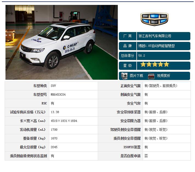 C-NCAP自个去4S店买了一辆博越(博越1.8T自动两驱智慧型),做了一场安全碰撞测试。呵呵,58.2分的成绩,5星评价。什么概念?神车途观(上代)的成绩是48.2分,主打安全的福特翼虎是55.9分。当然,不是说途观跟翼虎的表现不好,只是因为博越牛逼得有点过分。在完全正面碰撞试验里,博越的得分成绩比例为95.17%,接近满分。而侧面碰撞试验里,则完全满分。就一个字:太特么强悍。