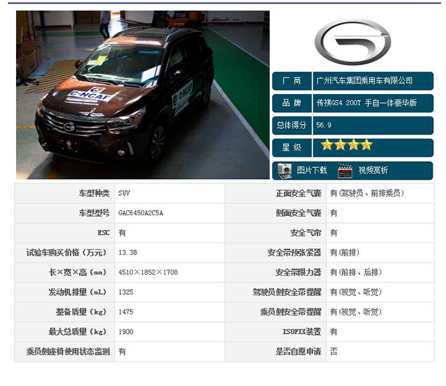 所以,C-NCAP也心狠手辣地到市场上买了一辆传祺GS4(传祺GS4 200T 手自一体豪华版),并且做了安全碰撞测试。结果,噔噔噔噔~总体得分56.9分,4星评价。同样也是秒天秒地,秒大众的节奏。总得分,甚至还比豪华品牌X1还要高山0.3分。要是你特别在意安全,不用买宝马,买传祺就好了。