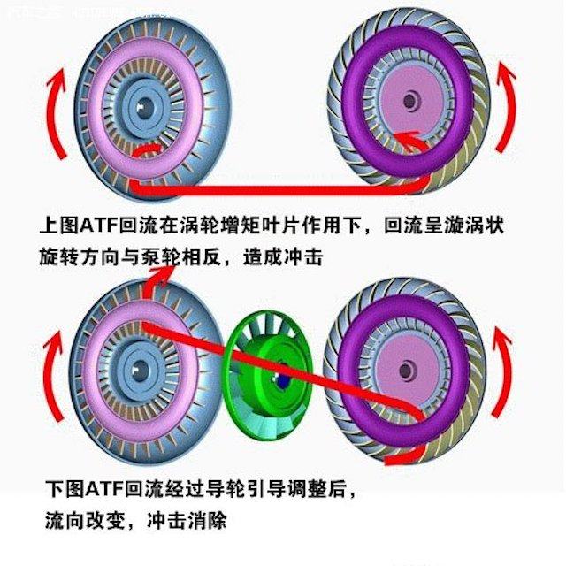 动力输出之后,带动与变矩器壳体相连的泵轮,泵轮搅动变矩器中的自动变速箱油(以下简称ATF),带动涡轮转动,ATF在壳体中是一个循环的动作,由于泵轮旋转时的离心力,ATF会在泵轮的作用下,甩向外侧,冲向前方的涡轮,再流向轴心位置,回到泵轮一侧,如此周而复始的循环,将动力传向与齿轮箱连接的涡轮。