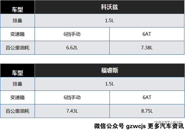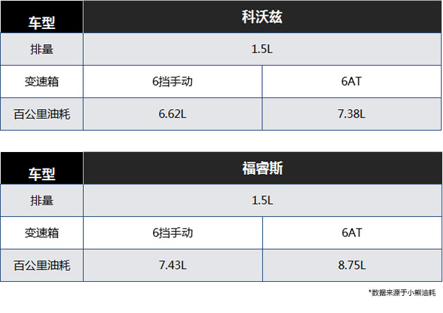 很明显两款车型的手动车型油耗相比自动车型都有着明显的优势。不过两车相比较的话,则科沃兹自动版本比福睿斯有着1L多的差距。福睿斯的综合油耗也不过8.75L/100Km而已,相比日系车虽然有些差距,但已经称不上耗油大户了。