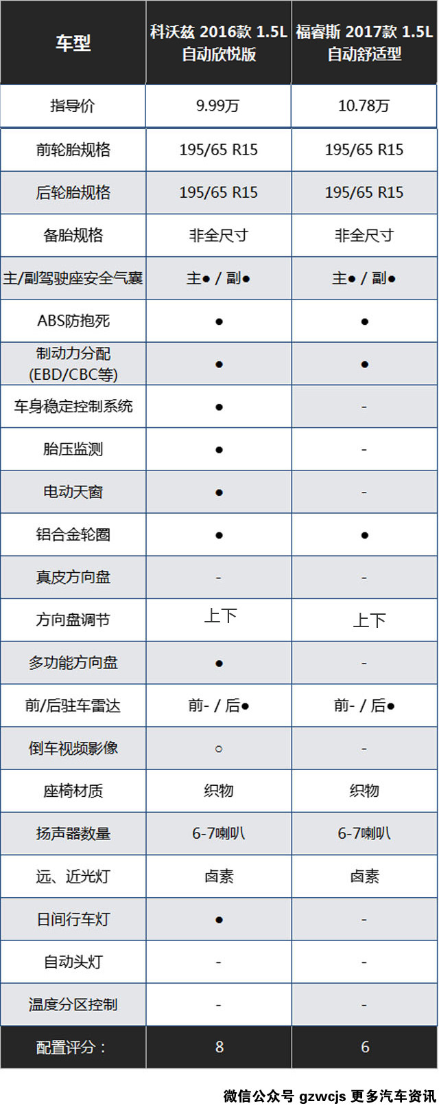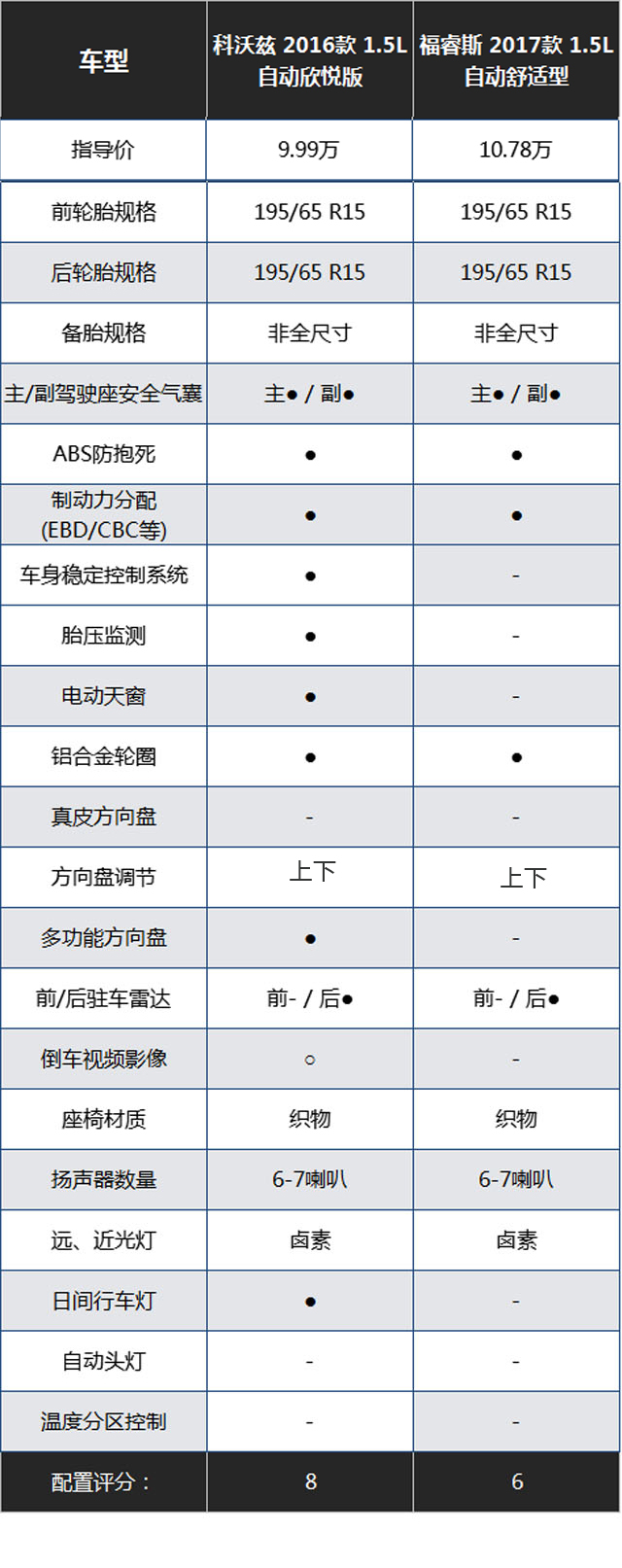 虽然福睿斯比科沃兹有着近1万元的差价,但科沃兹却拥有着比它更丰富的安全配置。例如胎压监测、刹车辅助与ESP都是福睿斯所不具备的,安全性很明显科沃兹更胜一筹。这些配置都是时下买车时很关注是否有具备。科沃兹面世较迟的缘故,它比福睿斯还配备多了上坡辅助与自动启停技术,日常实用性更好一些。