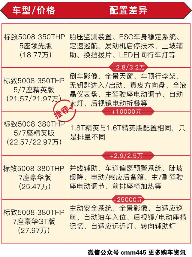 你可以把5008看作是4008 PLUS版,只是加大车身尺寸更大并增加了第三批座椅,除此之外并没明显区别,且售价非常接近,在全民套娃的年代感觉设计师都不需要了。标致5008售价为:18.77-27.97万,全系共有7款车型,分别为1.6T及1.8T车型,车型的增多也让消费者疑惑:标致5008到底哪款性价比更高?