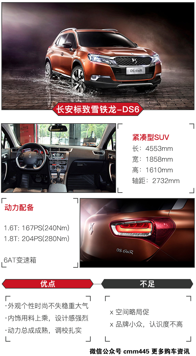 DS6相比于DS品牌家族中的一款相对“纯正”的SUV,整体造型相对内敛柔和,不算过于天马行空的外观也是虎哥认为整个DS家族中最为人所接受的一台。从外观和内饰设计相对跳跃的主体上看还是可以认得出它是一款来自法国设计师的作品。