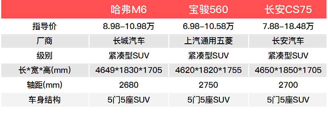 面对两个老对手,哈弗M6没有特别明显的优势。例如它的轴距在三者当中是最短的,这样一来M6在空间上就没有很多的优势了,但这恰恰就是国人最注重的地方。另外这三款车型搭载有1.5T发动机,不过宝骏560的1.5T车型没有自动挡则略逊一筹,但CS75比较丰富的动力总成则是M6所不具备的。最后M6能够凭借的应该就是经过全新设计的外观造型了,可以给年轻人带来不少新鲜感。同时哈弗H6多年来积累的口碑应该也能够帮助它吸引不少注重可靠性的消费者。