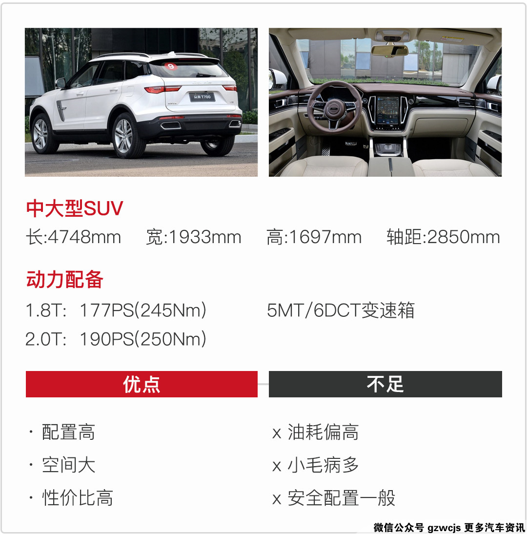 本来这辈子能不能开上兰博基泰和法拉泰就指望众泰了,没想到众泰开始不务正业,搞了个T700出来。T700可以说是众泰众多车型中原创度最高的一款,去掉了浓浓的山寨风之后,给人的整体视觉效果还是不错的。T700的内饰采用上下撞色设计,10.1英寸的大屏加上旋钮式换挡机构很能提升X格,也提供了方向盘换挡拨片,标配了全景天窗。10万出头能买到中大型SUV和这么越级的配置,还有不少配置是高端车才会有哦,不管实际意义有多大,反正X格提高了很多,可玩性也不错。如果在一个月黑风高的晚上,一个女生在看不清车标的情况下上了T700,她可能真的以为上了豪车。