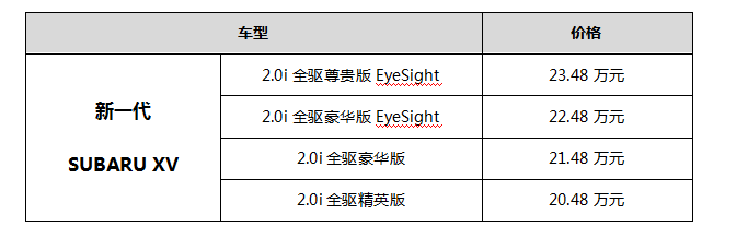 本次发布上市的新一代SUBARU XV共有2.0i全驱精英版、2.0i全驱豪华版、2.0i全驱豪华版EyeSight、2.0i全驱尊贵版EyeSight四款车型,价格区间为20.48-23.48万元,为每一位年轻消费者提供了极具吸引力的选择。