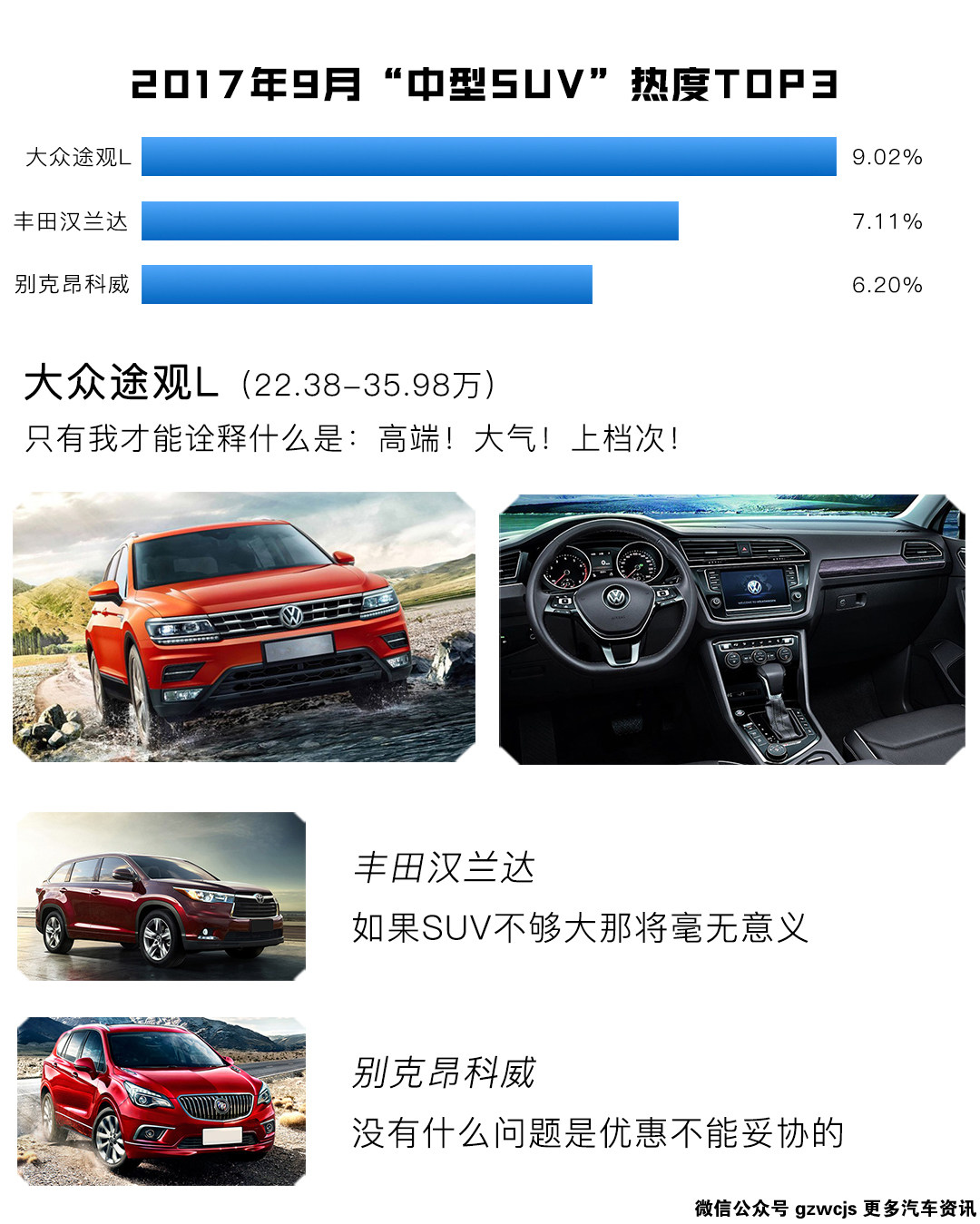 中型SUV的车市热度远不及小型和紧凑型的SUV,最火的就是途观L了,外观内饰性能各方面完全不逊色其它同级车型,虽然价格上未能体现优势,不过也算得上物超所值,中型SUV的标杆性车型;大空间也是昂科威的一大卖点,同时内饰的档次相当高,可是价格给力,也是有很多消费者埋单的。