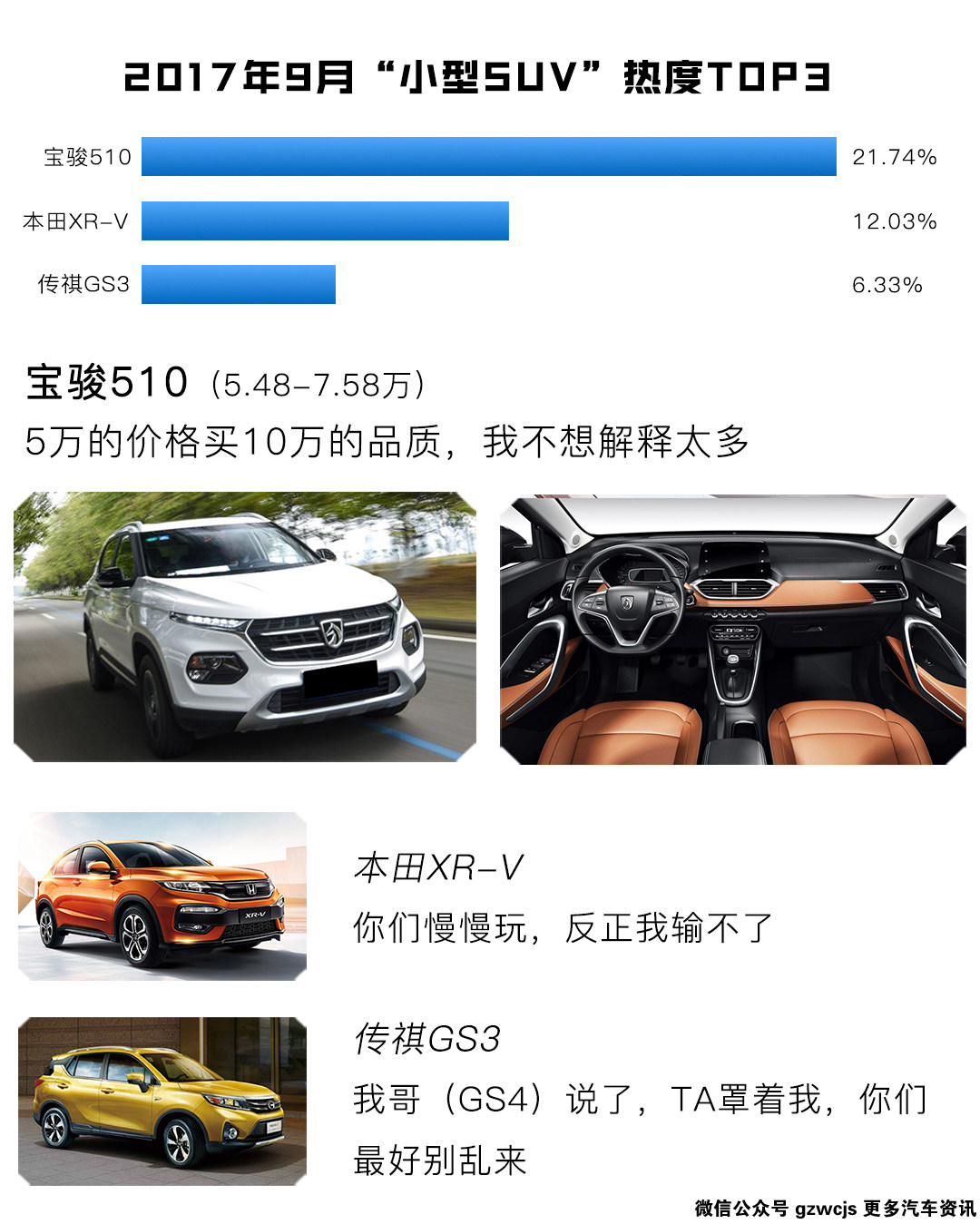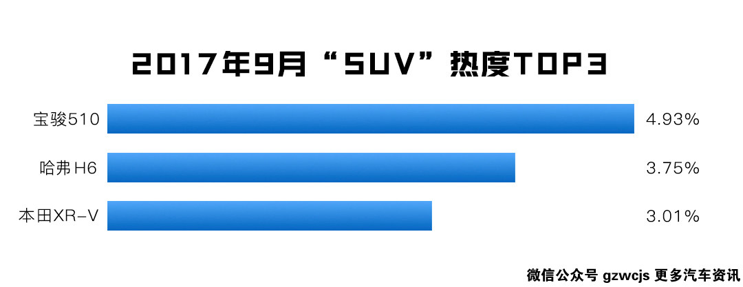 能在整个SUV车市热度里一举登顶的宝骏510,在细分的小型SUV市场也是如鱼得水,热度几乎是TOP2本田XR-V的两倍;当然XR-V的热度也是一直持续中,表现出一种老哥很稳的状态;而凭借大哥GS4的名气与声望刚上市一个多月的传祺GS3成功挤进前三,传祺GS3拥有与GS4媲美的外观,而价格更低,如果你瞬间被吸引了,又不想第一个吃螃蟹,又急着用车,虎哥还是建议你选宝骏510更稳。