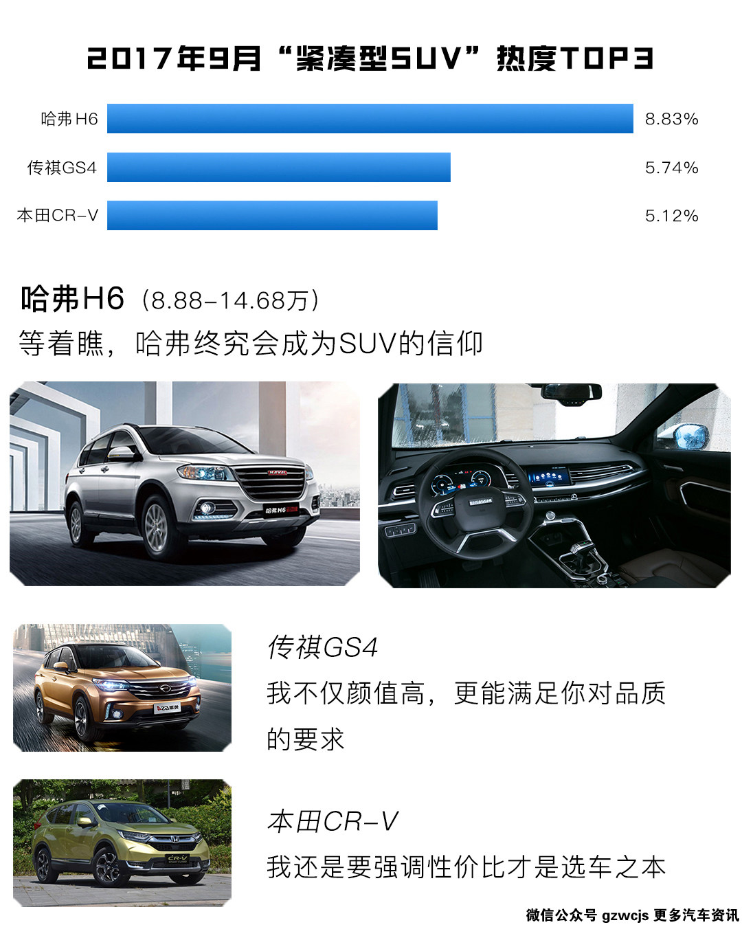 当然哈弗H6也是绝对优秀的车型,TOP1的位置毋庸置疑,现款车型的内饰整体风格跟H2S一样,非常个性简洁,且有科技感,能成为紧凑型SUV热度和整个SUV车市月销NO.1的车型,这套内饰的加持非常关键;传祺GS4的不断提升也是感动了不少消费者,虽然车市热度还是不及哈弗H6,可是越来越完善的车型也给H6不少的压力;而CR-V的复活热度也一直持续着,毕竟良心车型,值得关注。