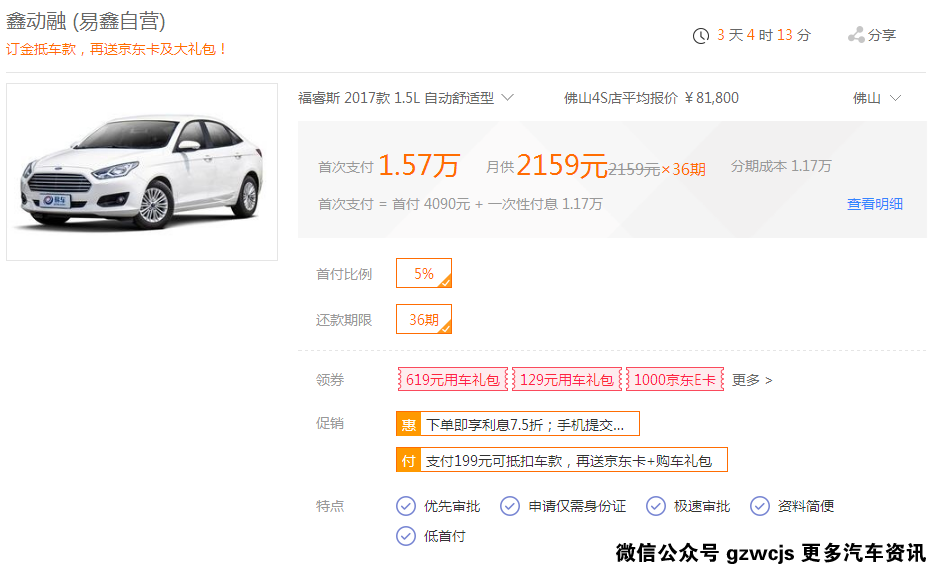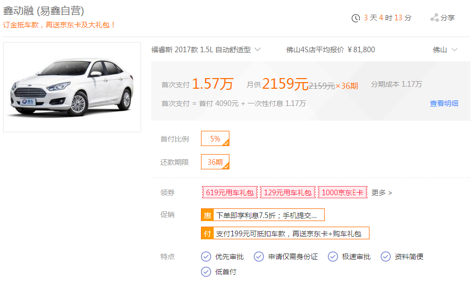 第二款爆款车型是家庭型轿车,福特福睿斯,搭载的是1.5L最大功率113马力直列四缸发动机,配备6AT变速箱,只需首付1.57万,分36期,月供2159元就能开走。