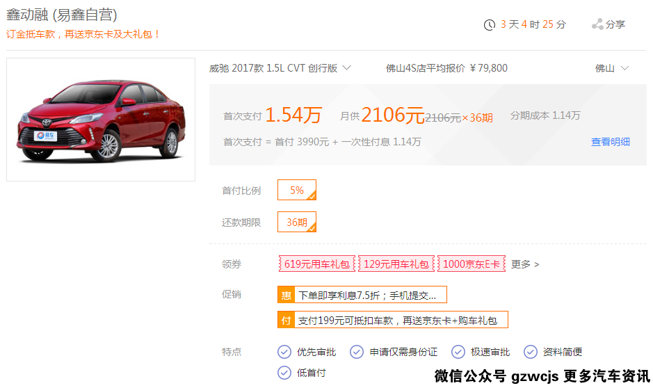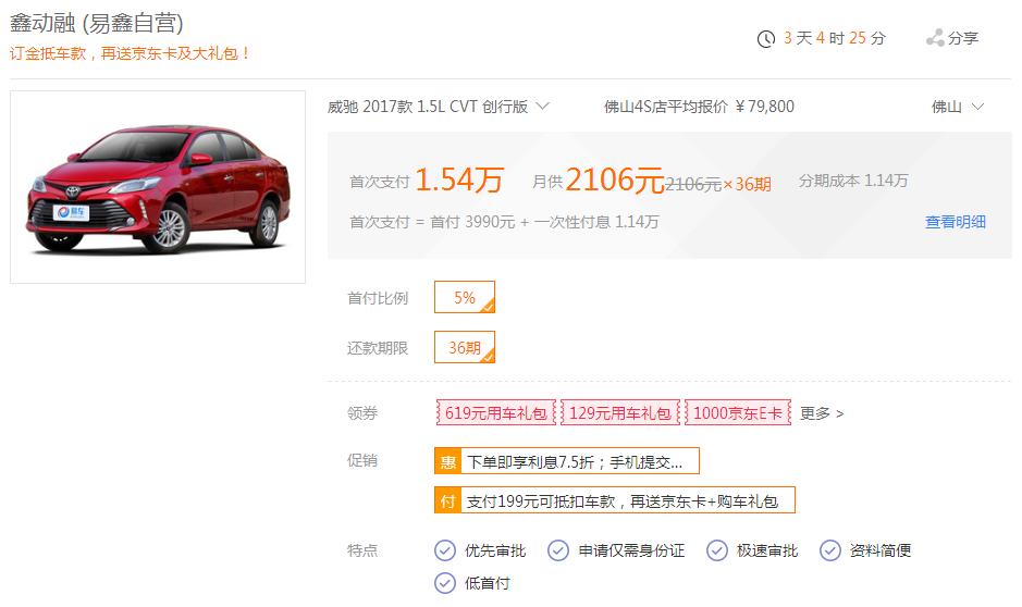 除了以上2款爆款,还有一款省油神车,丰田威驰1.5L S-CVT创行版,最大功率107马力,模拟8挡的CVT无级变速箱,市面上的用户都对这款车有较高的评价,无论代步还是周边出游,都能满足一般家庭使用,在淘车双11活动上只需首付1.54万,36期分摊下来月供也才2106元,工薪阶层绝对能轻松负担。