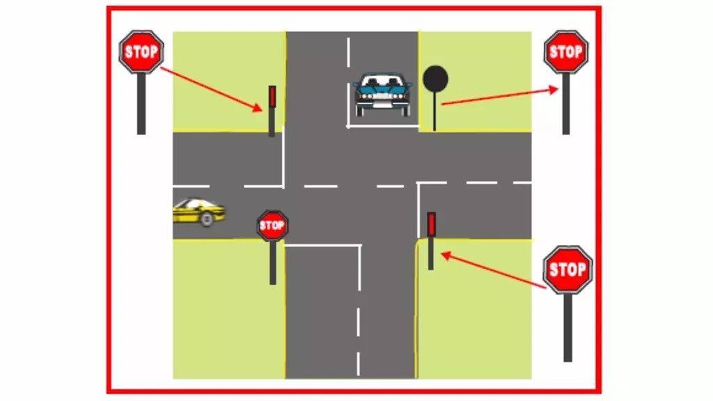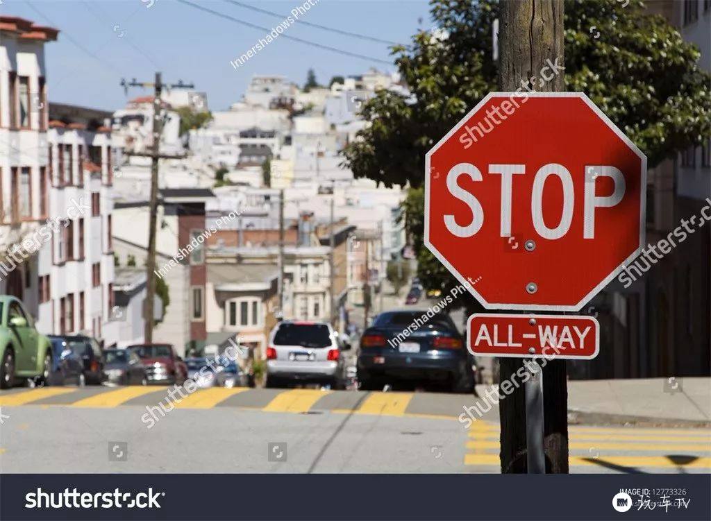 如果路口前有车,前车走了以后你也要完全停下来再走。如果碰到十字路口,每个路口都有STOP,则谁先到路口的谁停顿了再走,不能抢,谁抢谁的责任。