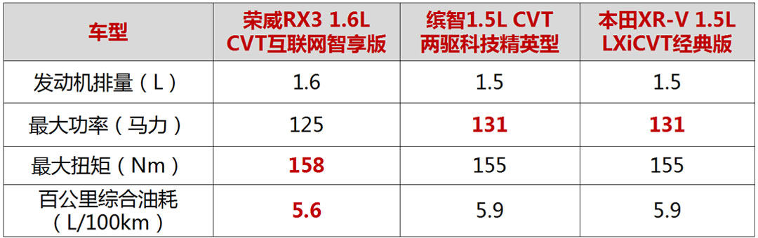 如果追求更强动力的话,荣威RX3的1.3T+6AT的动力总成比不少对手的1.5T都要出色,最大功率163Ps,而缤智和XR-V的1.8L车型最大马力仅136Ps,相比1.5L车型提升并不大。