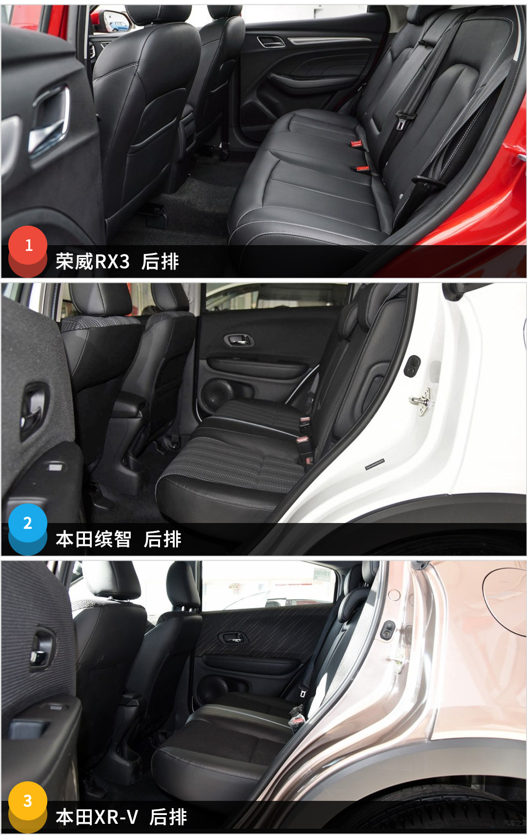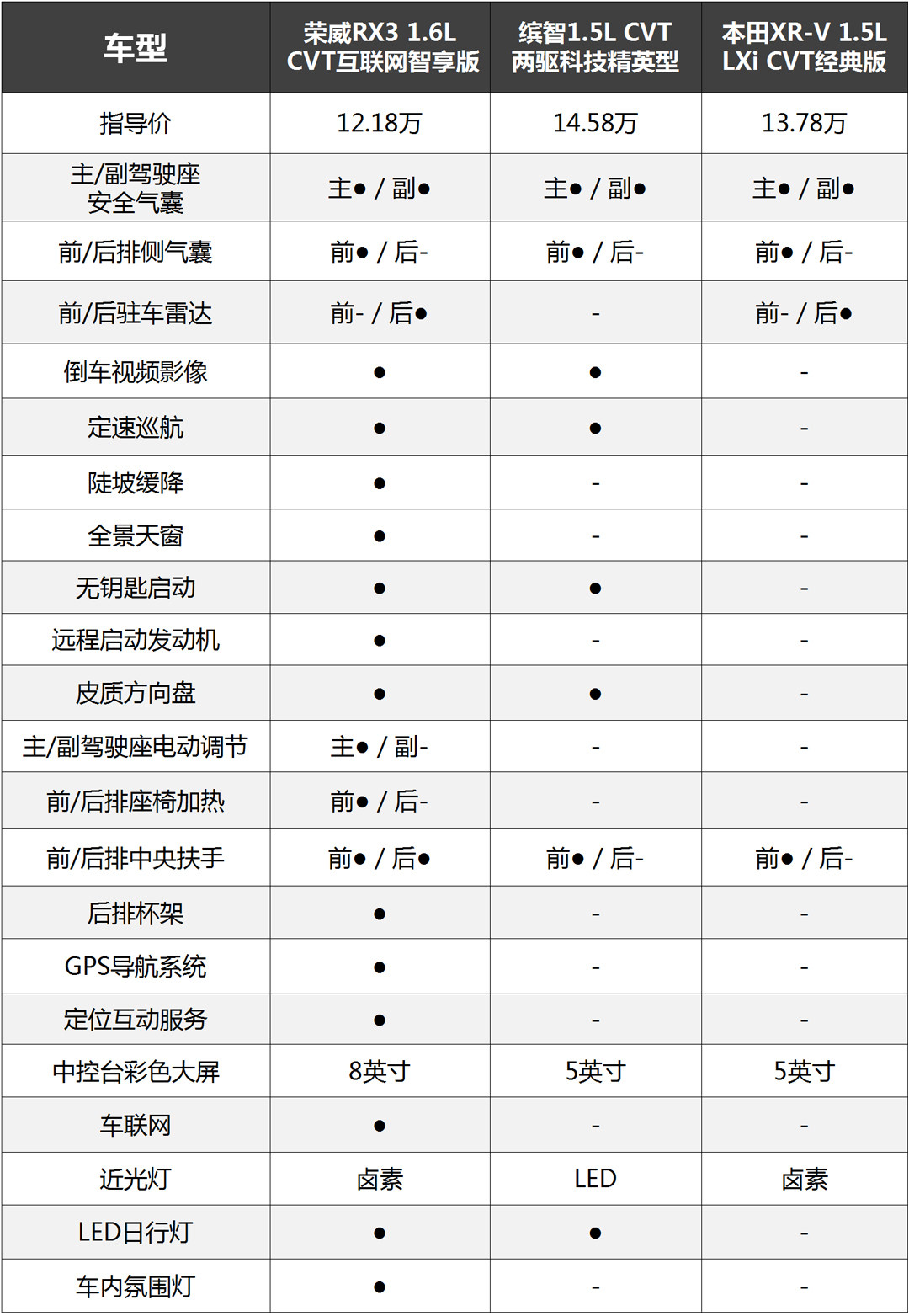 配置方面,荣威RX3无疑是最厚道的,即使是次低配的车型的配置就已经非常丰富,全景天窗、倒车视频影像+8英寸中控彩色大屏和皮质座椅等非常显档次的配置都已经配备。此外,前排加热、主驾驶电动调节、LED日行灯等人性化的配置也非常丰富,8英寸的中控大屏相比缤智和XR-V的5英寸用起来也更爽。相比之下,缤智只是LED近光灯这一项有优势,XR-V的配置表现在三车之中是最差的。