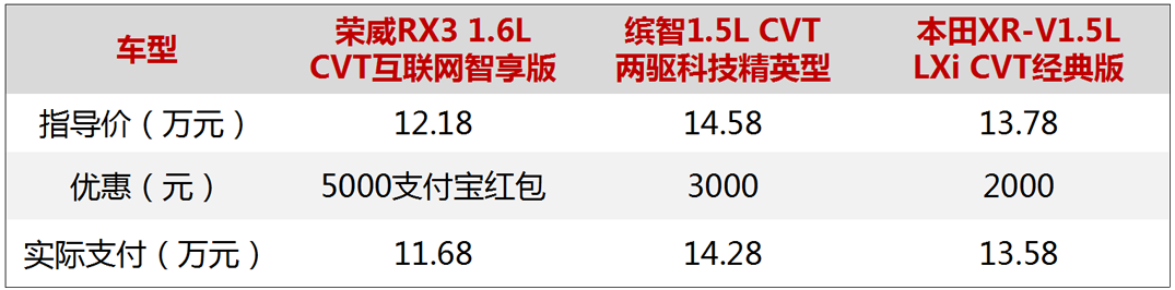 先看下价格和优惠情况,本田的车一般都没多少优惠,缤智和XR-V的优惠分别为3000和2000,荣威RX3虽然是新车上市没有优惠,不过由于有5000块的支付宝红包,优惠还是不错的,总价也是最低的。