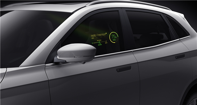 侧面还有一个十分出彩的设计,就是在车窗上带有交互界面,可显示充电时间、续航里程、剩余电量等车辆信息,也可以与手机互联,显示车主的行程安排、路线等,充分体现人工智能化。