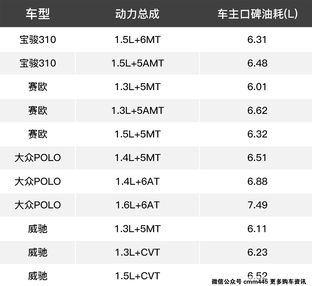 像威驰、飞度等小型车换上了CVT变速箱,宝骏310和赛欧则采用了传输效率较高的AMT变速箱,加上较轻的车身,这些因素均有利于降低油耗。