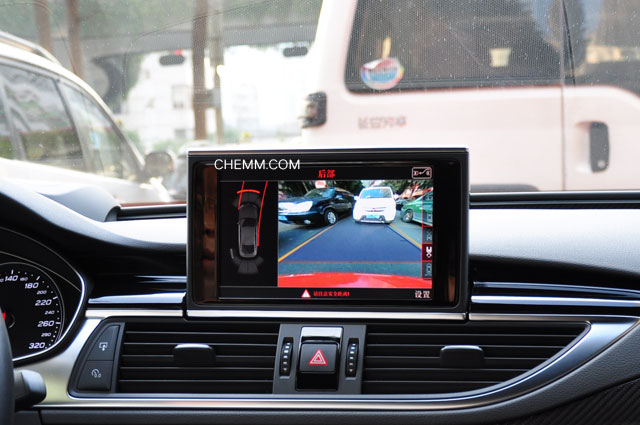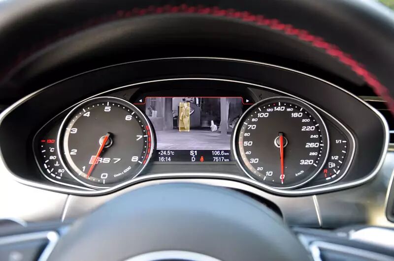 RS7车身达5米,倒起车来并非一件轻松的事情,RS7除了装备自动泊车之外,前后均有摄像头作为安全辅助,当打开停车辅助按钮时,你低速前进的时候,它前摄像头会自动开启,帮助你观察前方;而你倒车时,摄像头会自动切换到后摄像头,十分智能。当然,你也可以通过车上的按键来切换前后摄像头,这个在堵车的时候很实用,你可以观察前后车离你的距离,更为安全的跟车。
