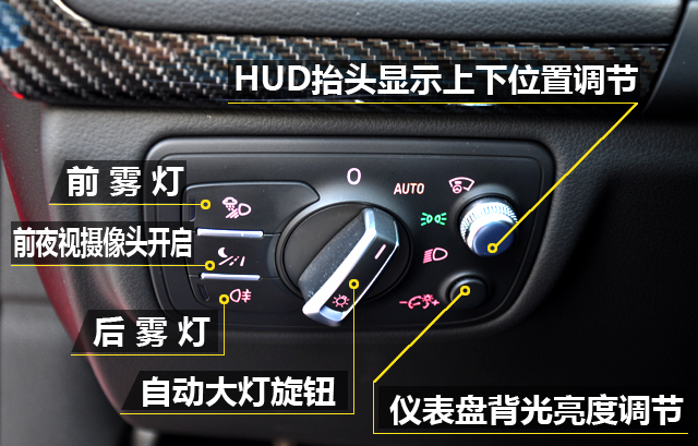 RS7的功能配置繁多,因此按钮也特别多,比如下图的灯光区,就集成了HUD位置调节、仪表盘及背光亮度调节、夜视摄像头开关及自动大灯等按钮,这些功能键的位置设定较为合理,用起来也得心应手。