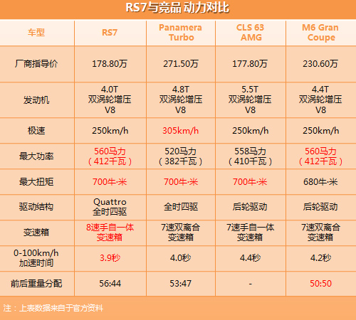 RS已经是奥迪全系中第二快的车系(第一是R8),对标宝马M Power及奔驰AMG,简单的说,RS7的加速已经达到超跑级别。我们先来看看下表:
