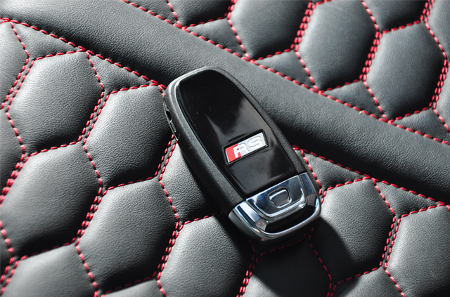 座椅采用了蜂窝状样式,乘坐舒适度在后面的章节我会提到。这里说说钥匙吧,毕竟当车子停在车库,我们能炫耀的就只有钥匙了。RS7的钥匙与普通奥迪车没什么区别,只是在钥匙正面印上了RS的LOGO,这显得有些低调了,不过钥匙还是蛮有分量的,质感做得不错。