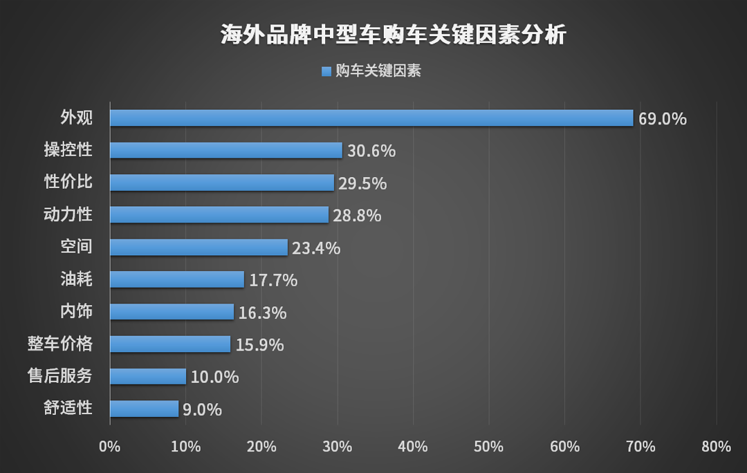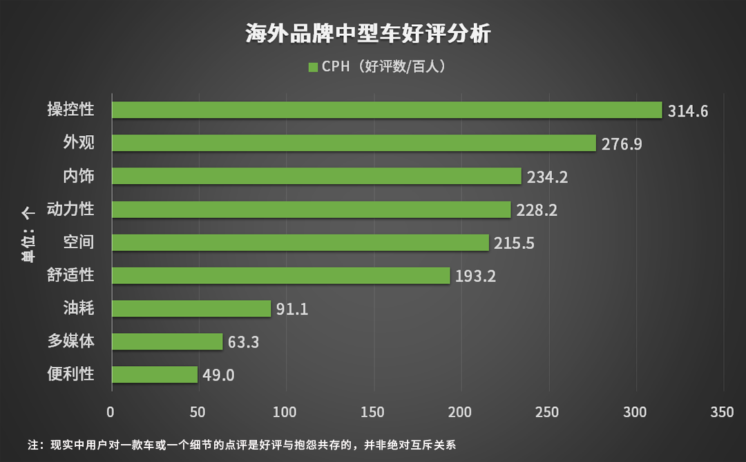 根据车主购车关键因素数据显示,外观因素占据了购车的主导地位,这个结果也并不令人意外,买中型车的消费者更希望拥有高颜值、有面子的车型,特别是那些经常需要出入商务场合的人士。其次考虑的主要因素还有操控性、性价比、动力性以及空间等。那么究竟哪方面最能获得用户好评呢?