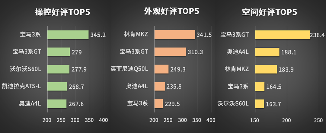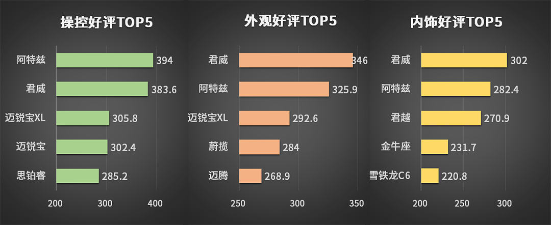 下面我们来看看在操控、外观、内饰这三个方面表现出色的TOP5车型: