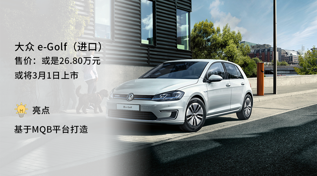 e-Golf是一款纯进口的电动车型,或将在3月1日正式上市;以替代现如今还在销售的进口高尔夫GTE(插电式混合动力车型);e-Golf是一款基于第七代高尔夫打造的纯电动紧凑型轿车,续航里程相较于老款车型(GTE)有所提升,达到255KM;可以说是一款城市通勤状态下的新选择。
