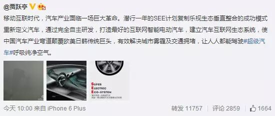 贾跃亭今日上午在微博上留下一句话:“移动互联时代,汽车产业面临一场巨大革命。潜行一年的SEE计划复制乐视生态垂直整合的模式重新定义汽车,通过完全自主研发,打造最好的互联网智能电动汽车,建立汽车互联网生态系统。”