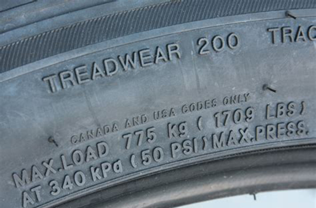 第二个需要留意的就是“Tread Wear”。这个数字代表轮胎的磨耗系数,磨耗系数乘以300英里或乘以500公里就等于理论最大行程。磨耗系数越大,代表轮胎越耐磨,可供行驶里程也越大。