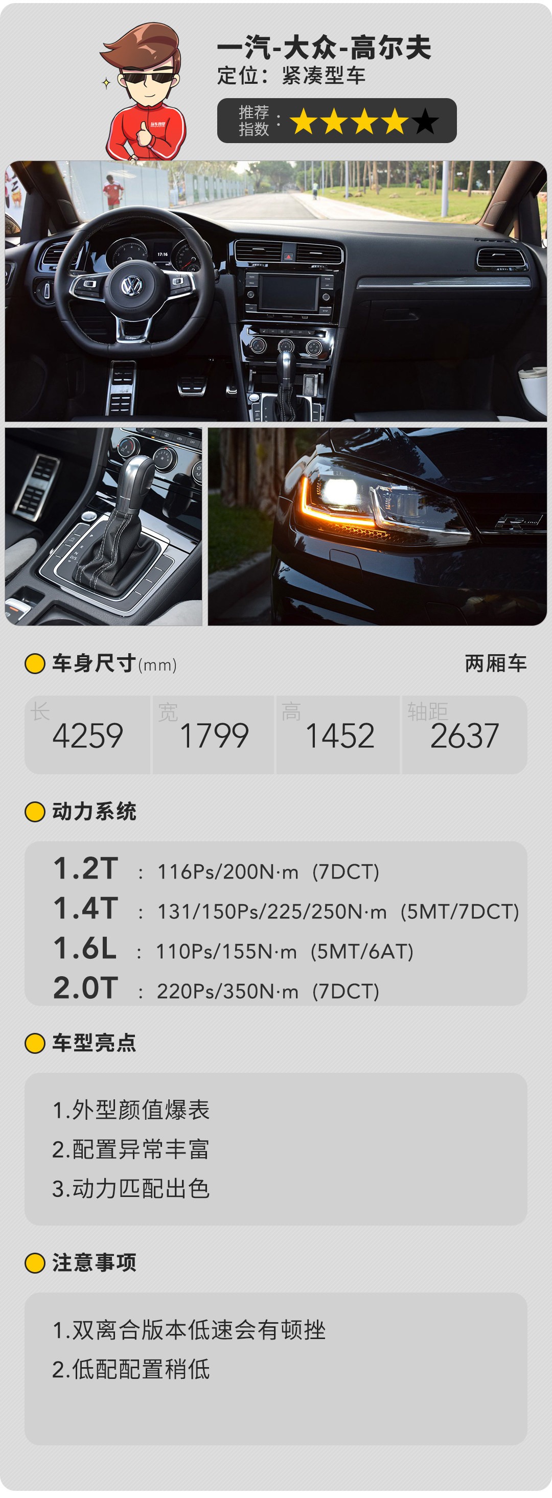 在所有车型中,教授推荐1.4T的车型,配置比较丰富,日常使用舒适度也高。动力方面1.4T车型有分高功率跟低功率版本,两款不仅都能满足日常家用,加速感也很出色,能够满足平时的一点点小“激情”。