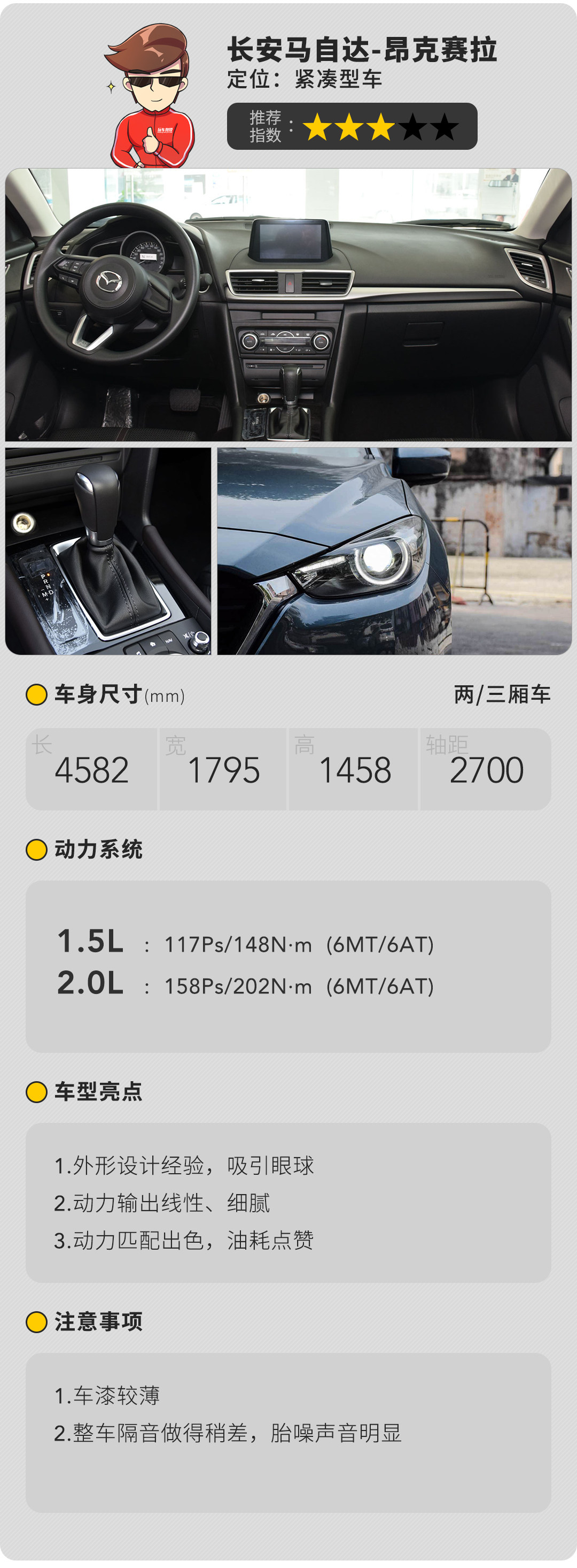 作为紧凑型车,除了运动也要能照顾家庭需求,AE86也有两厢版和三厢版,昂克赛拉也有也很正常。动力上算不上出色,不过在涡轮时代还在用自吸发动机这点确实要点个赞,毕竟线性的加速才能称作是人车一体。至于缺点?肯定有,空间小,低配“蜡烛灯”,噪音大等等,不过依然掩盖不了“很好开”的光芒,只要开着它上一段山路,分分钟就能上瘾。