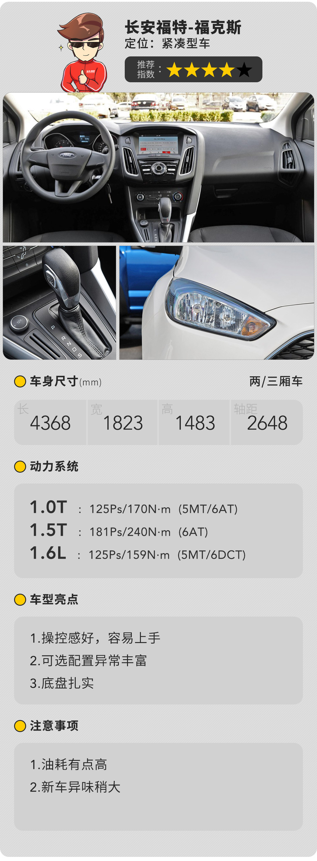 福克斯这么多年来都一直打着既能“买菜用”,也能“送豆腐”(有驾驶乐趣)的名号来卖车,实际下来也确实如此,提供两厢版和三厢版满足年轻人对家用定义的需求。对于喜欢动力的朋友,1.5T版本是一个非常值得选择的版本,最大功率在同价位紧凑型车里属于领先地位,达到181匹马力,日常驾驶感受非常畅快,尽管这并不利于油耗表现。