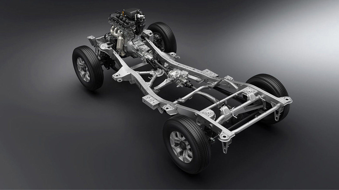 除了回归经典的造型之外,更值得关注的还是新车在机械设计上的进步。首先,作为一款硬派越野车,第四代吉姆尼依然采用非承载式车身,但是阶梯式大梁车架新增了两根横向强化拉杆和一个X型加强架,以增强车架刚性,优化公路行驶性能。不过悬挂设计则依然保持着经典的越野配方:前后三连杆硬轴非独立悬挂。