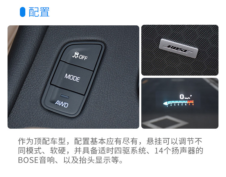车型配备了电子可变阻尼悬挂,驾驶模式有舒适模式、四驱模式、运动模式和沙地模式,舒适模式下的悬挂是最软、最舒服的,即便是路过烂路、减速带等不会带来什么不适,很典型的开大车的感觉,运动模式下悬挂硬了一点点,侧倾的一致也是,但不太明显。