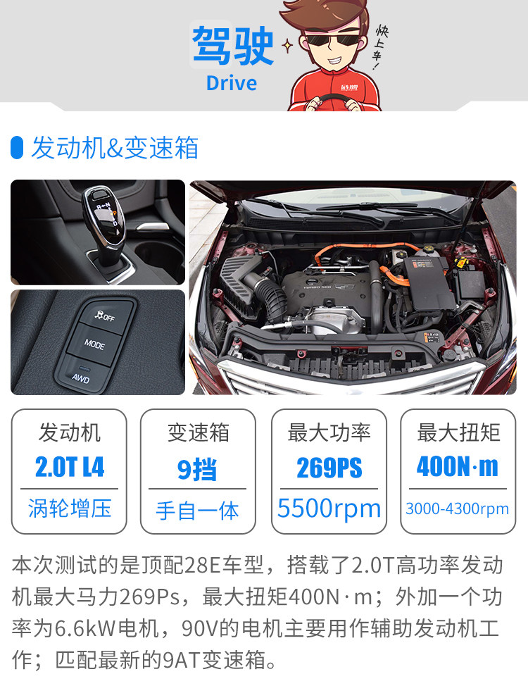 提速轻快是第一个感觉,这也是90V电机的功劳了,这幅电机可以输出49N·m扭矩,在启动和低速行驶时,即便车重达2吨,也不会让你有丁点的笨重感,而且整车隔音做得相当出色,本身隔音就做得很到位,还带有主动降噪功能,速度上来以后,2.0T发动机作为主要动力输出,开起来是又安静又有力。