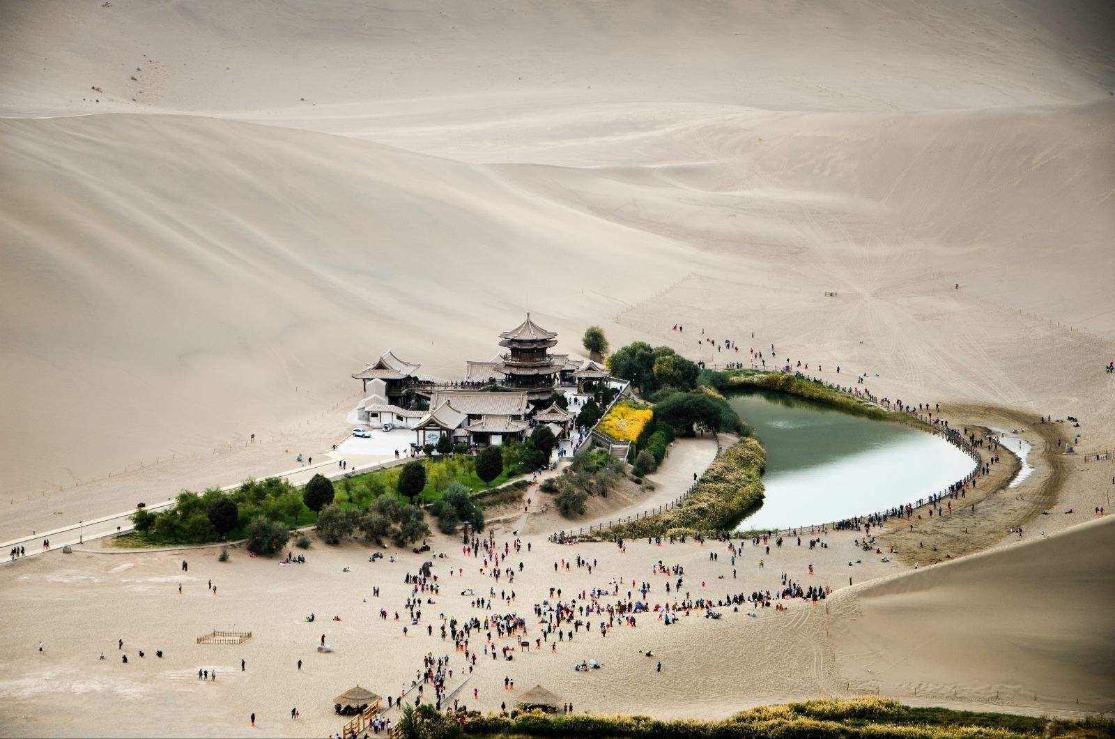 鸣沙山由一系列绕着月牙泉的沙丘组成,得名于其独特的形状和音效特点。当风吹过沙丘时,便可听到回声。