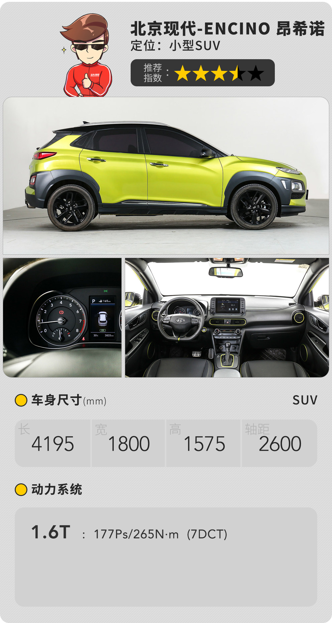 这款“长相奇特”的小家伙,提供多种车身颜色可供选择,可能在图片看不出,不过当看到实车之后,你会发现它确实非常漂亮。而1.6T+7速双离合变速箱在驾驶体验下很出色,一改现代汽车给人的传统印象,动力强劲、转向运动、悬架硬朗。不过对于探险用车来说,少了海外版才有的四驱系统,实在差点意思。