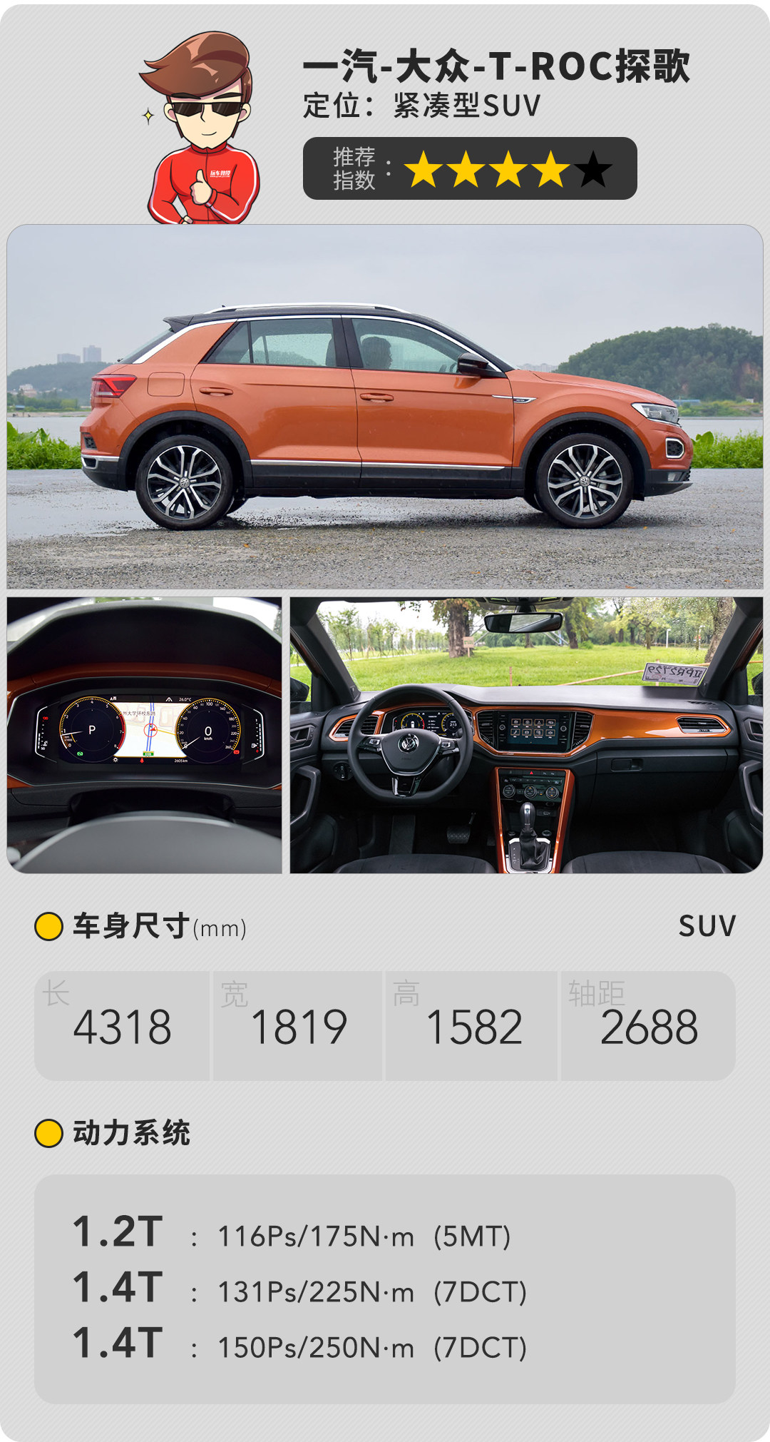 海外版的T-ROC探歌定位为小型SUV,而在国内为了顺应群众,特意加长,也使得定位成为紧凑级SUV。这款基于MQB-A1平台打造,也是一汽大众的首款SUV,在推出之时就备受瞩目。很多人说探歌与日系厂商相比,外形内饰根本称不上年轻,但是相比起大众旗下其他SUV车型,它可是年轻了“几十岁”。