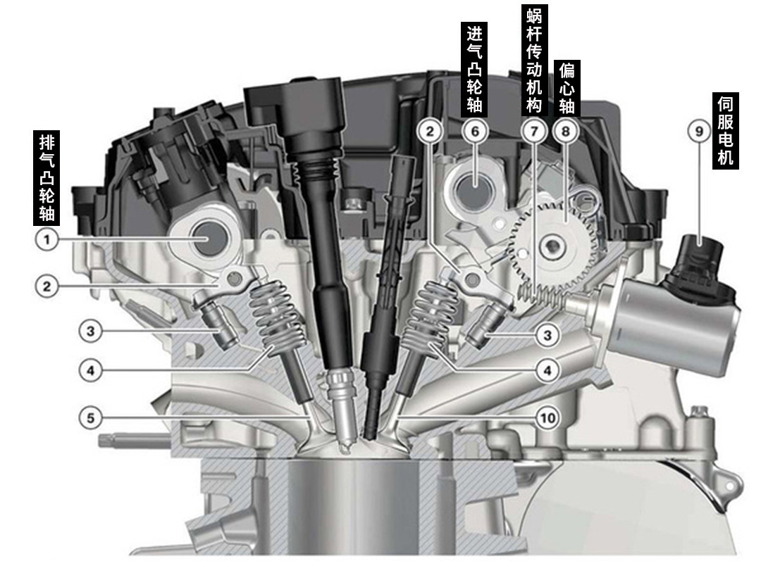 Valvetronic电子气门与本田VTEC技术的目的一样,都是为了实现进气门升程变化,只是实现的方式有所不同。BMW的Valvetronic系统在传统的配气相位机构上增加了一根偏心轴,一个步进电机和中间推杆等部件,该系统借由步进电机的旋转,再在一系列机械传动后很巧妙的改变了进气门升程的大小。在电机的驱动下,进气门的升程可以实现从0.18mm到9.9mm之间的无级变化。