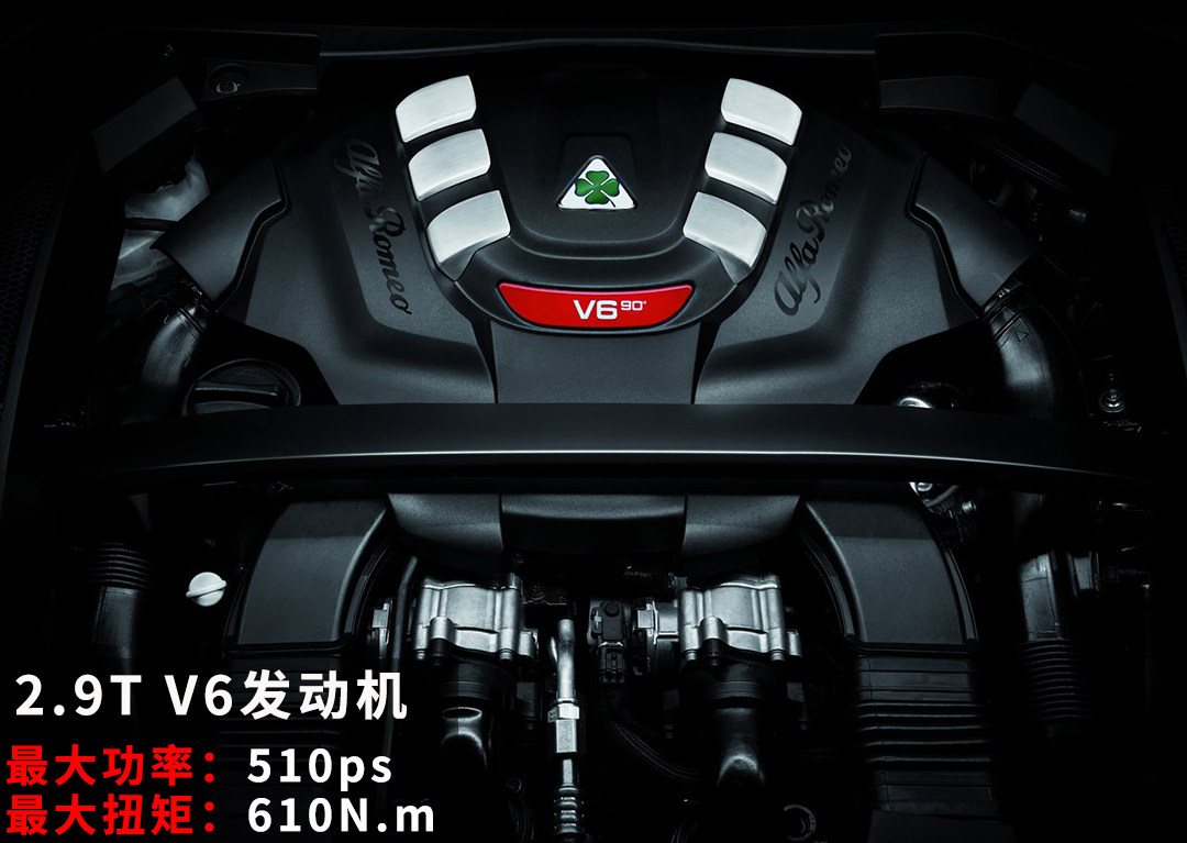 打开机舱盖,无论你认不认识这个品牌,看到这个四叶草标都应该感到敬畏。这台源自于法拉利的全铝发动机在缸径等数据上都与法拉利F154发动机相同,两颗IHI的涡轮分别为两侧气缸独立增压,效果更好,并采用了只应用于赛车的90度气缸夹角设计,Top Gear就曾经评价其“就是法拉利的V8去了两个缸”。2.9T排量虽比许多竞品要小,但510匹马力,610牛.米的动力却是很多3.0T及4.0T发动机所不可比拟的,
