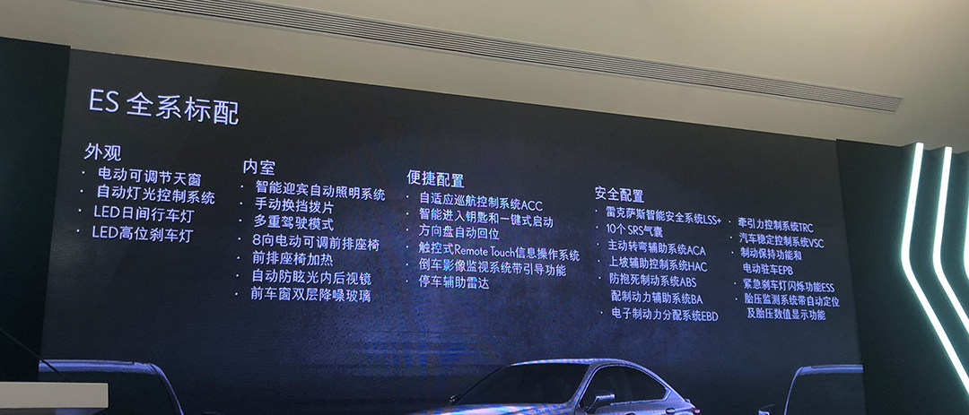 接下来到配置部分,由于车型定位的不同,如果同样是低配车型,凯美瑞和ES的标配配置水准也存在一定差异。ES上,天窗、自动大灯、换挡拨片、8向带加热电动座椅、双层隔音玻璃以及ACC等成为标配这都还不够,更“过分”的是,连雷克萨斯智能安全系统LSS+、10气囊等安全科技都成为了全系标配,没错,即便是27.9万起的ES 200卓越版也没落下。