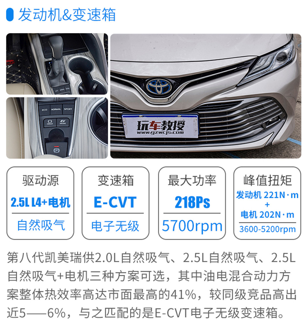 我很喜欢运动版凯美瑞,但如果说能够把动与静结合得更恰到好处,自然是混动版(双擎)车型。混动车型的这具2.5L发动机比燃油版更极致,压缩比高达14:1,热效率逼近41%,动力系统的综合输出表现接近运动版车型,而主要是低速行进中,纯电模式能给用户带来友好感。